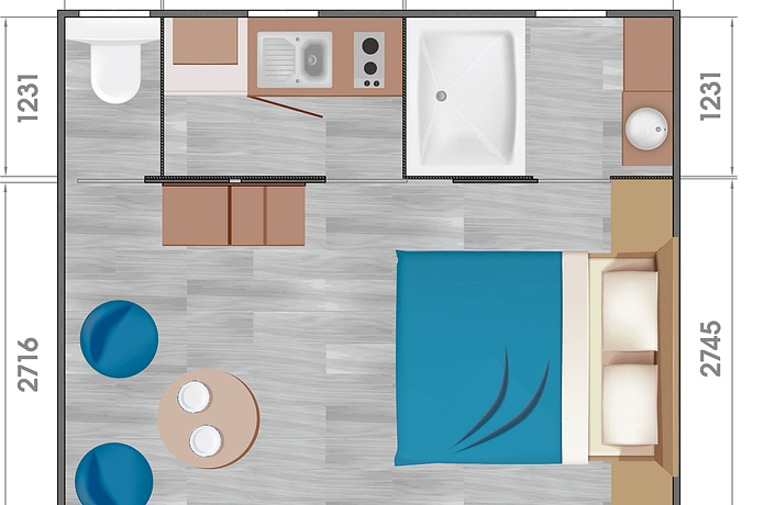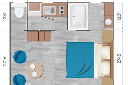 Une chambre avec 2 lits surélevés de 90 x 200 cm, une chambre avec 2 lits superposés de 90 x 200 cm et une salle d’eau avec vasque, douche et WC.